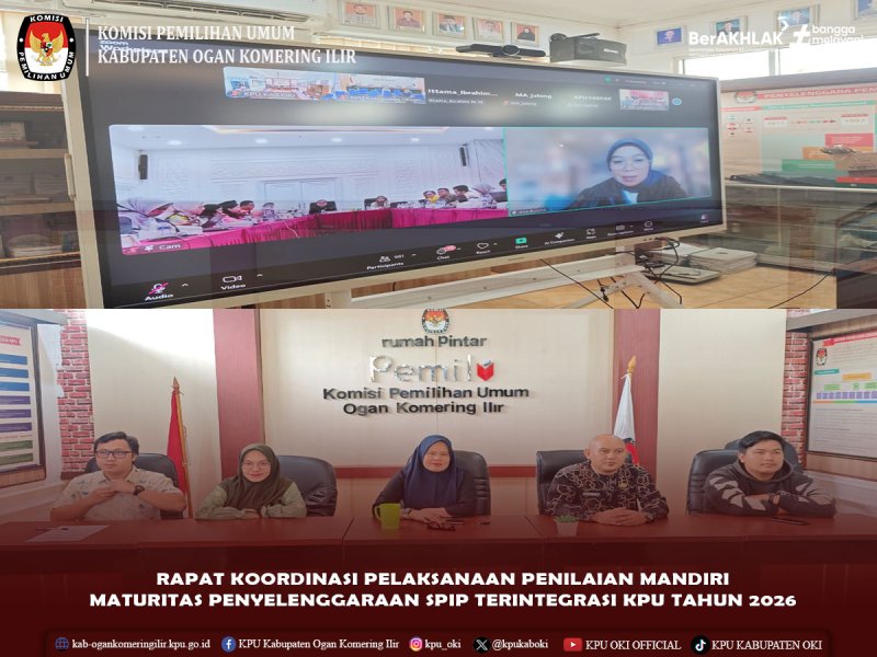#TemanPemilih, KPU Kabupaten Ogan Komering Ilir mengikuti Rapat Koordinasi Pelaksanaan Penilaian Mandiri Maturitas Penyelenggaraan SPIP Terintegrasi KPU Tahun 2026 yang dilaksanakan oleh KPU Republik Indonesia melalui zoom meeting pada Jum'at, 30 Januari 2026. Turut hadir Ibu Ani Septiana (Sekretaris), bersama Operator SPIP dan jajaran kesekretariatan KPU Kabupaten Ogan Komering Ilir. #KPUMelayani