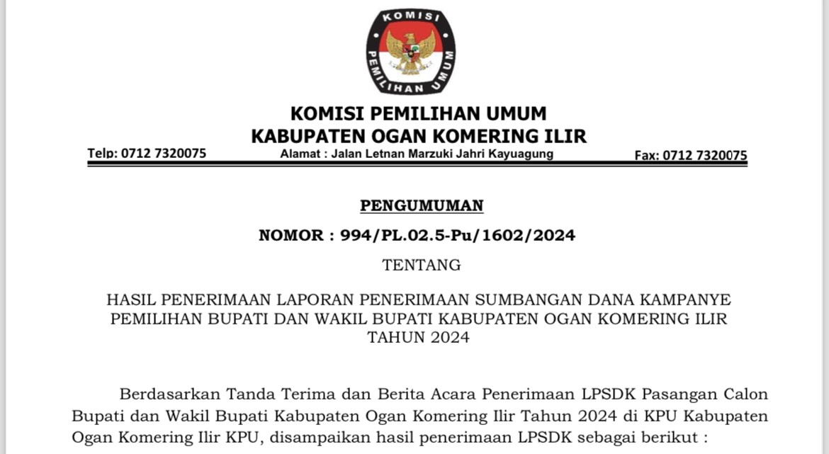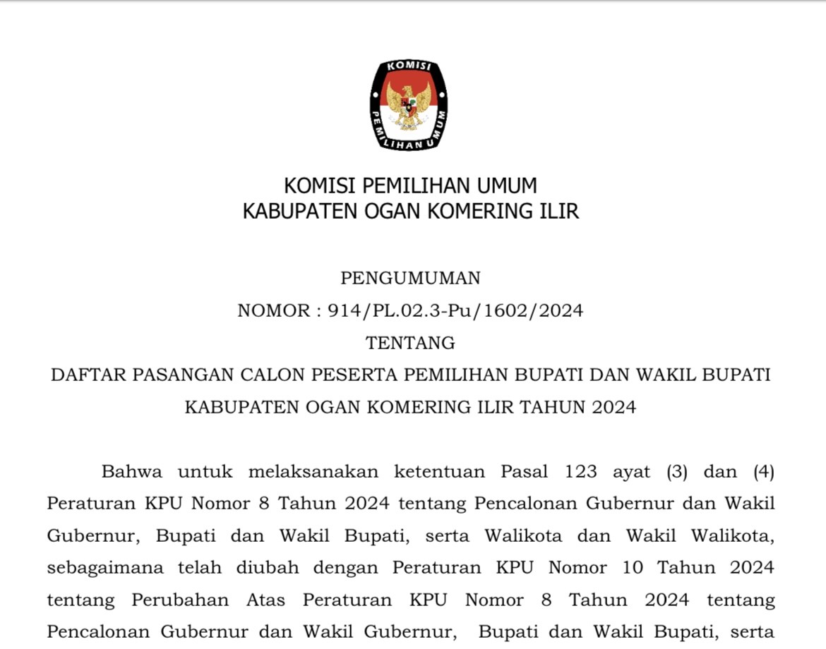 Bahwa untuk melaksanakan ketentuan Pasal 120 ayat (4) Peraturan KPU Nomor 8 Tahun 2024 tentang Pencalonan Gubernur dan Wakil Gubernur, Bupati dan Wakil Bupati, serta Walikota dan Wakil Walikota, sebagaimana telah diubah dengan Peraturan KPU Nomor 10 Tahun 2024 tentang Perubahan Atas Peraturan KPU Nomor 8 Tahun 2024 tentang Pencalonan Gubernur dan Wakil Gubernur, Bupati dan Wakil Bupati, serta Walikota dan Wakil Walikota, dan berdasarkan Keputusan KPU Kabupaten Ogan Komering Ilir Nomor 2864 Tahun 2024 tentang Penetapan Pasangan Calon Peserta Pemilihan Bupati dan Wakil Bupati Kabupaten Ogan Komering Ilir Tahun 2024, KPU Kabupaten Ogan Komering Ilir mengumumkan Pasangan Calon Peserta Pemilihan Bupati dan Wakil Bupati Kabupaten Ogan Komering Ilir Tahun 2024, sebagai berikut: